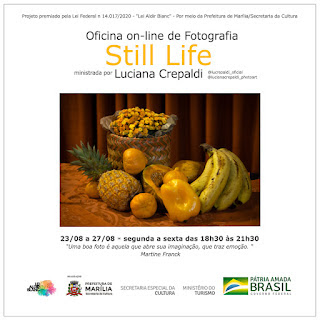A Secretaria Municipal da Cultura e a artista e arte-educadora Luciana Crepaldi, por meio de premiação da Lei Federal nº 14.017/2020 - "Lei Aldir Blanc", abrem as inscrições para o Ciclo de Oficinas de Fotografia, que acontecerá nos meses de agosto e setembro.