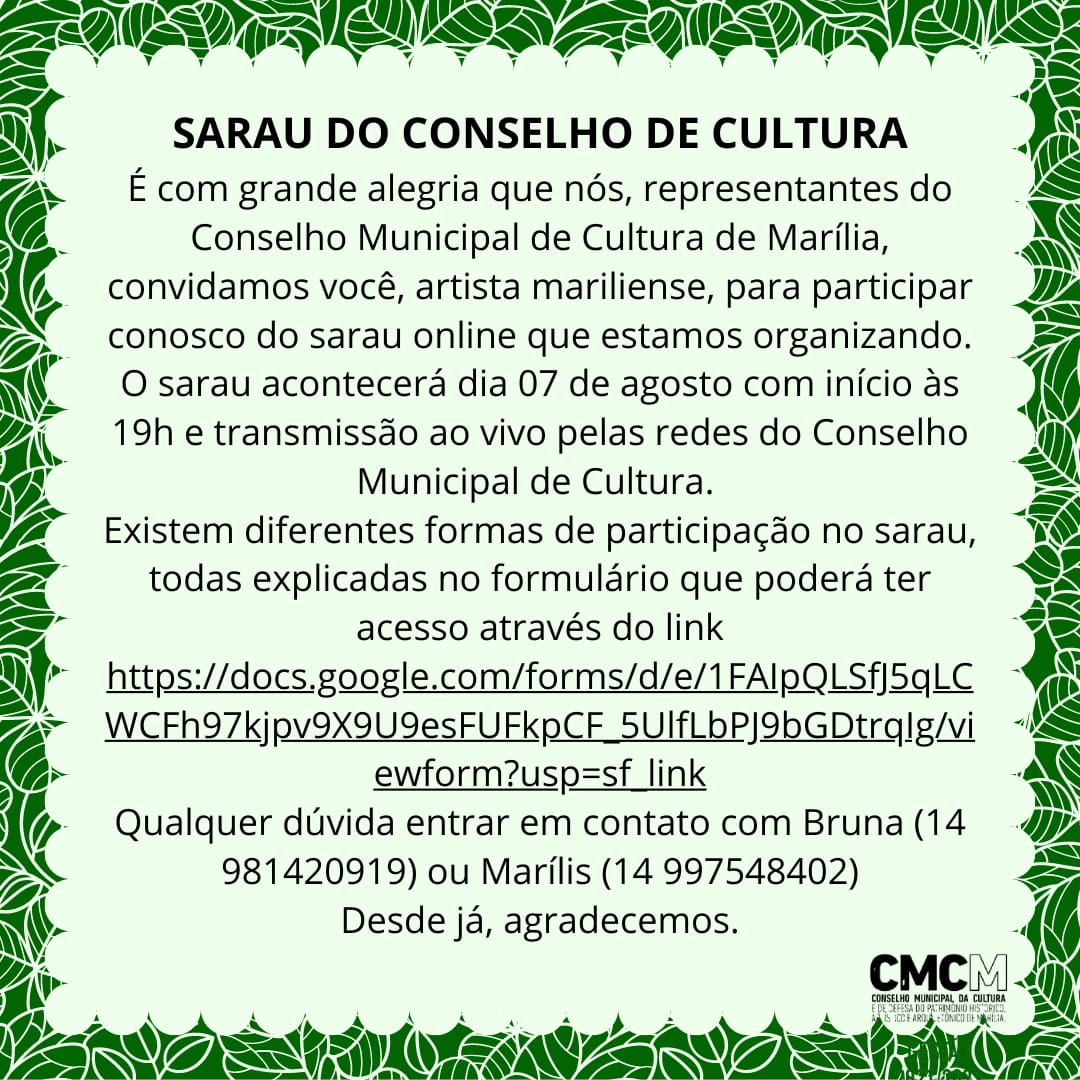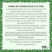O Sarau, que conta com apoio da Secretaria da Cultura, será realizado no dia 07 de agosto, de forma on-line, às 19h.