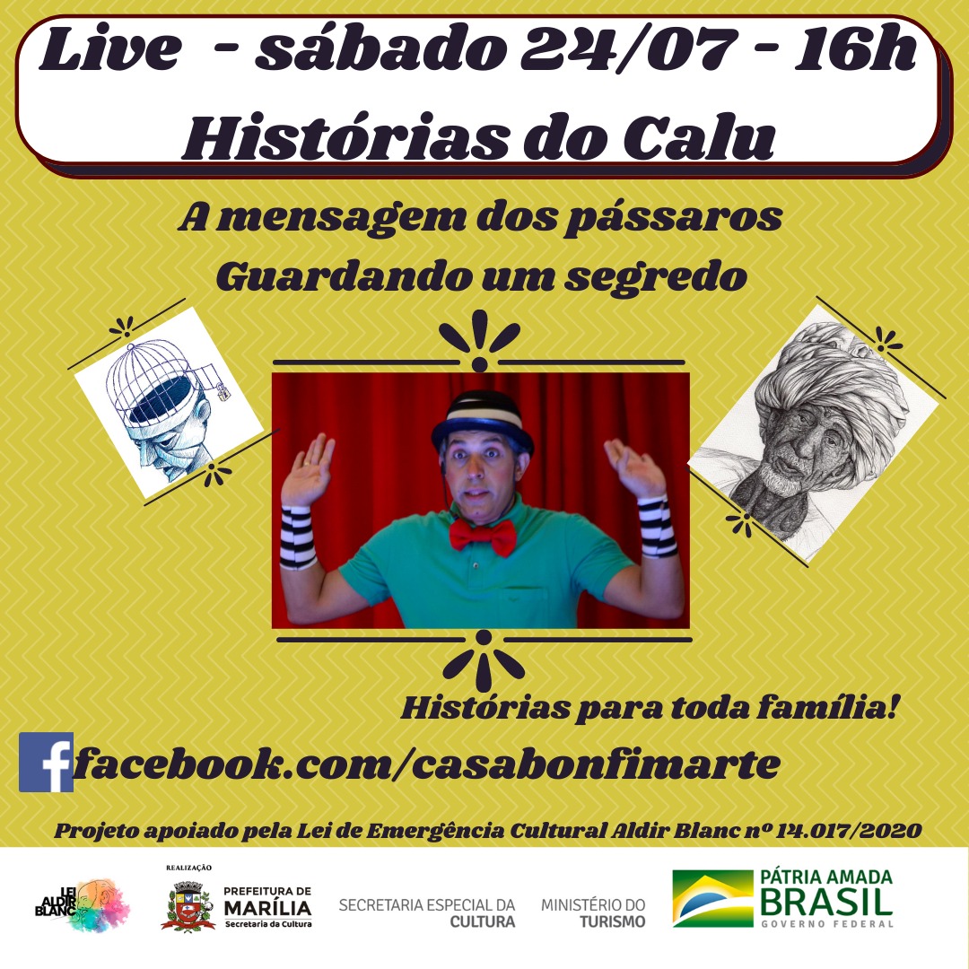 Sinopse: Nesta live de contação de histórias, viajaremos da casa do Calu até a Índia, vamos desbravar um cantinho mágico, descobrir alguns contos e fábulas e ouvir duas aventuras indianas. Com perfume de incensos e imaginação fértil, vamos conhecer a verdadeira mensagem dos pássaros e aprender a guardar um poderoso segredo. Venha se divertir! Histórias para toda família.