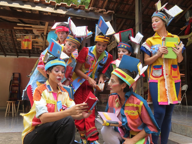 Na cena atores com livros por todos os lados, no ar e em suas cabeças, com performance literária, leitura pública de versos, poemas e narrativas curtas permeados por brincadeiras com trava-línguas e canções populares.