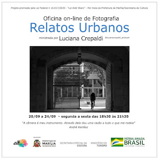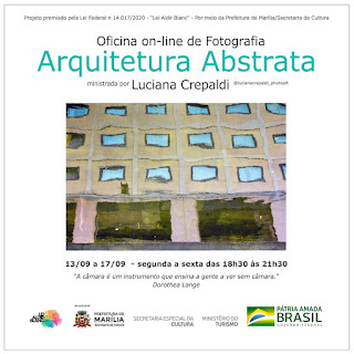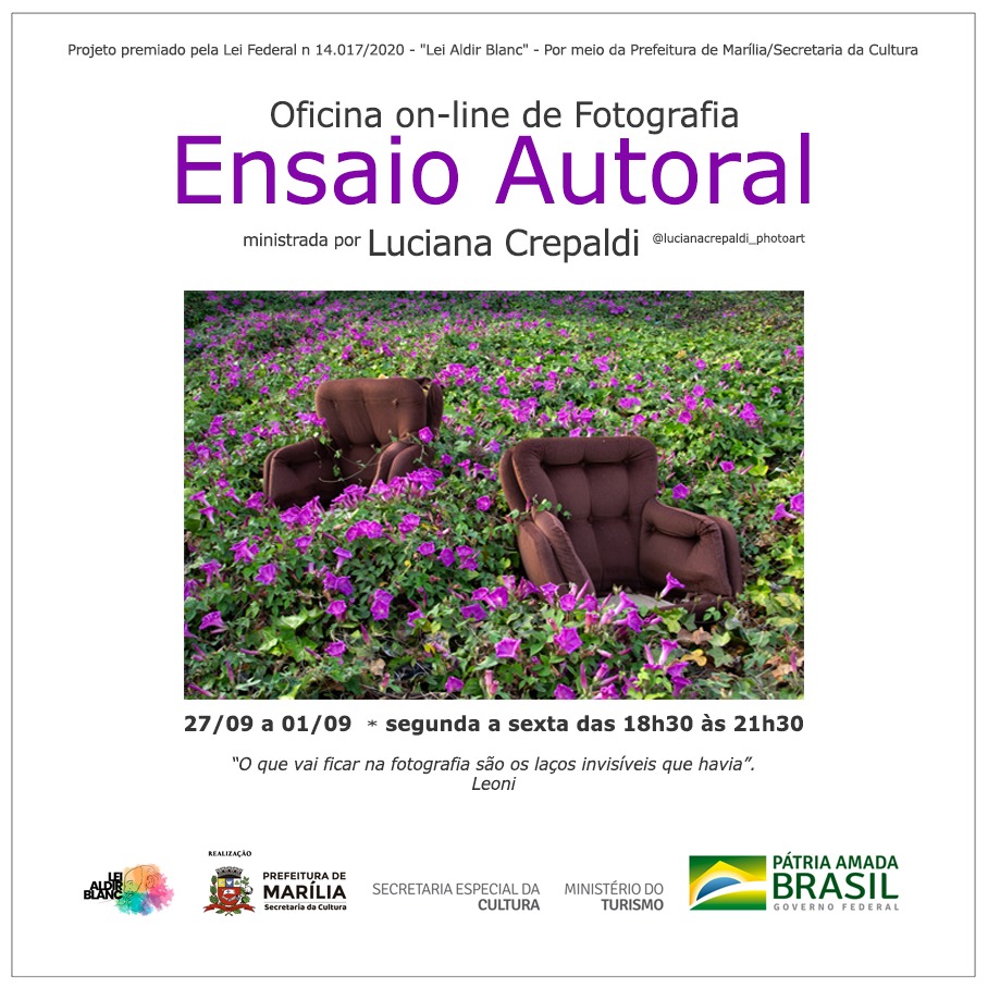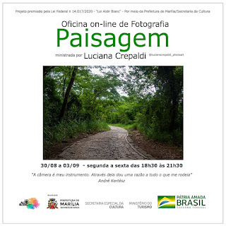 O projeto premiado pela Lei Federal n 14.017/2020 - "Lei Aldir Blanc" - por meio da Prefeitura de Marília/Secretaria da Cultura, de oficinas de fotografia de Luciana Crepaldi, segue a linha de ensino com enfoque e reflexões relacionadas a nossa realidade, estimulando a criatividade e a percepção visual, a sensibilidade estética, a capacidade narrativa através das imagens e a compreensão da linguagem fotográfica para fins de expressão pessoal, um olhar mais atento e diversificado, de forma que possa desenvolver uma linguagem particular.