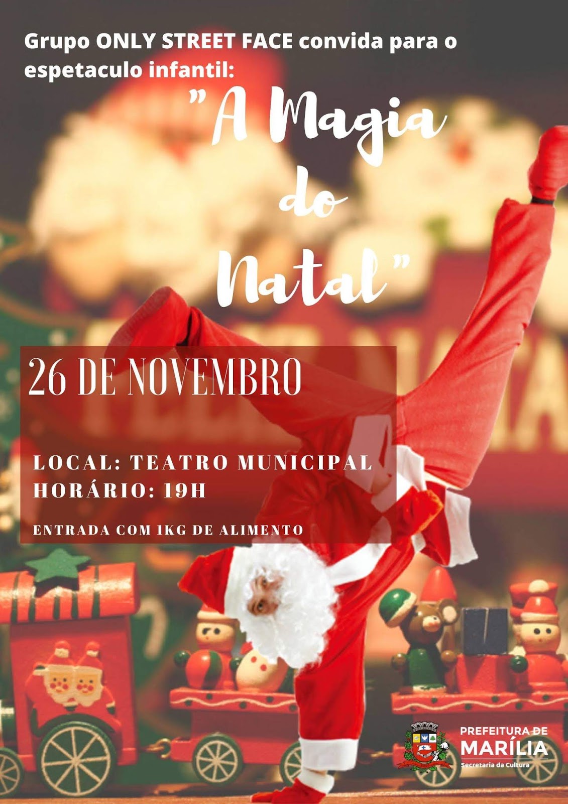 O Teatro Municipal “Waldir Silveira Melo” irá receber na próxima terça-feira (26), às 19h, o espetáculo de Dança de Rua “A Magia do Natal”, do grupo de dança Only Street Face. O evento conta com apoio da Secretaria da Cultura e a entrada é 01 Kg de alimento não perecível.