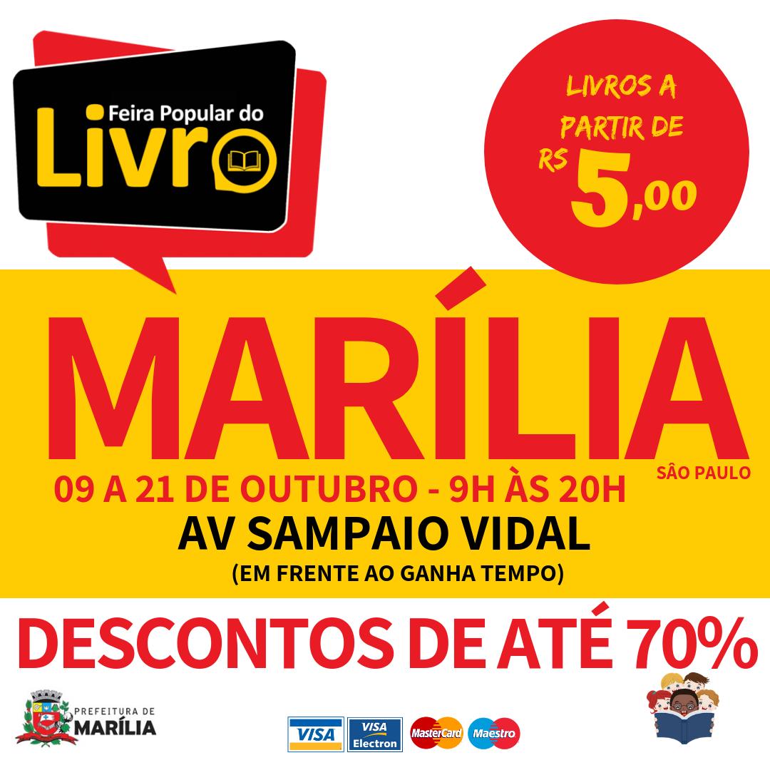 A Prefeitura de Marília, por meio da Secretaria da Cultura, traz para cidade “Feira Popular do Livro”. O evento acontece no período de 9 a 21 de outubro, na Praça Mário Consentino, localizada na Av. Sampaio Vidal (em frente ao Ganha Tempo).