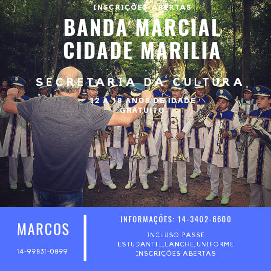 Estão abertas as inscrições para a Banda Marcial da Cidade de Marília, para crianças a partir de 12 a 18 anos, vagas para gênero masculino e feminino. Inscrições para parte musical e linha de frente.