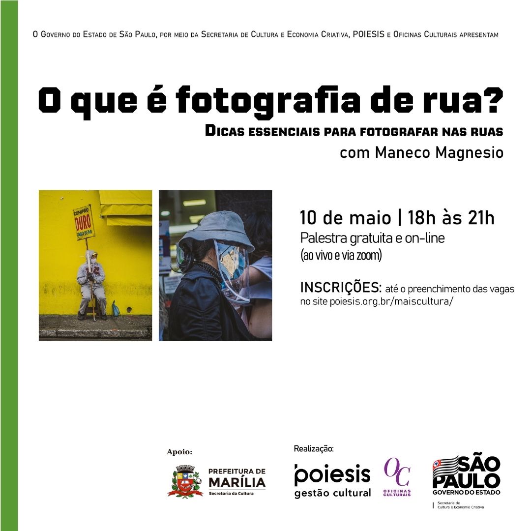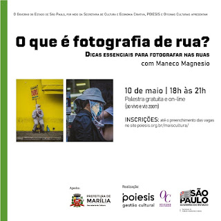 A proposta da palestra é abordar os princípios básicos da Fotografia de Rua na forma de um breve manual. Com dicas essenciais para fotografar nas ruas, equipamentos mais indicados, sua origem dentre as demais vertentes da fotografia, suas referências principais durante os séculos XX e XXI e ainda um panorama geral sobre a legislação que rege, no Brasil, as possíveis abordagens para fotografar pessoas, lugares públicos e privados, posicionamento ético do fotógrafo, além da relação de direito do autor e de uso de imagem, nas suas publicações em redes sociais, livros, entre outras.