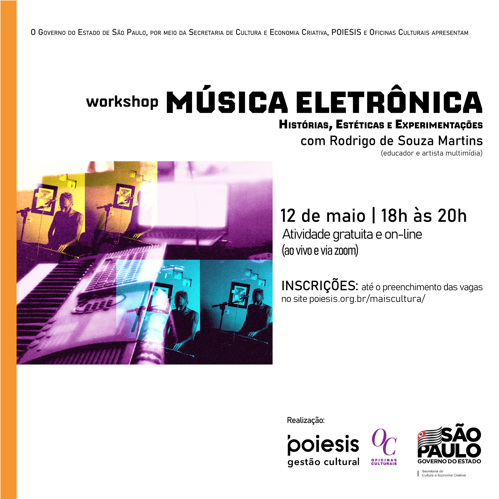 A partir de um percurso histórico pela música eletrônica e de exemplos práticos de experimentação com softwares de áudio, o workshop propõe um exercício de criatividade, fruição estética e reflexão em torno dos diversos contextos que envolvem a produção e circulação desse gênero musical, englobando diferentes estilos, lugares e épocas, investigando possibilidades técnicas e criativas presentes em obras diversas e experimentando com as múltiplas ferramentas digitais que se apresentam no trabalho com softwares.
