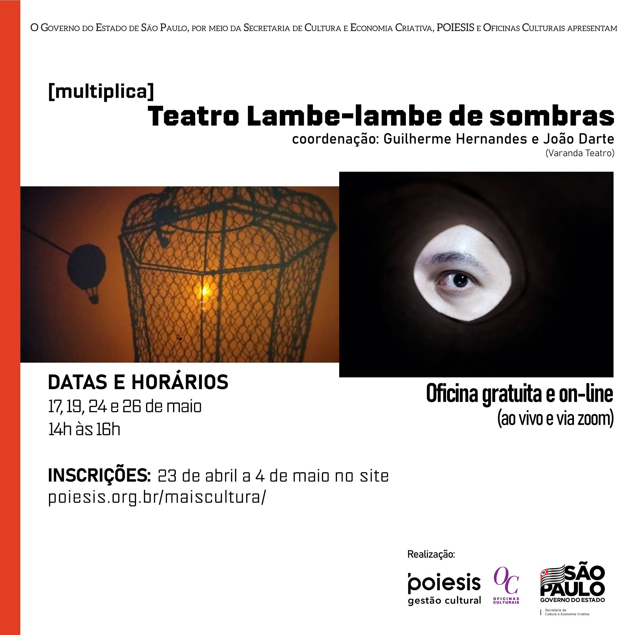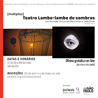 Em tempos pandêmicos, o grupo Varanda Teatro, de São José do Rio Preto (SP) busca compartilhar suas experiências e saberes através do universo virtual. Esta oficina, ministrada pelos artistas Guilherme Hernandes e João Darte, visa a introdução dos participantes aos princípios básicos do Teatro Lambe-lambe, utilizando-se de técnicas do teatro de sombras. Ao final, cada participante concluinte terá o seu Teatro Lambe-lambe de Sombras