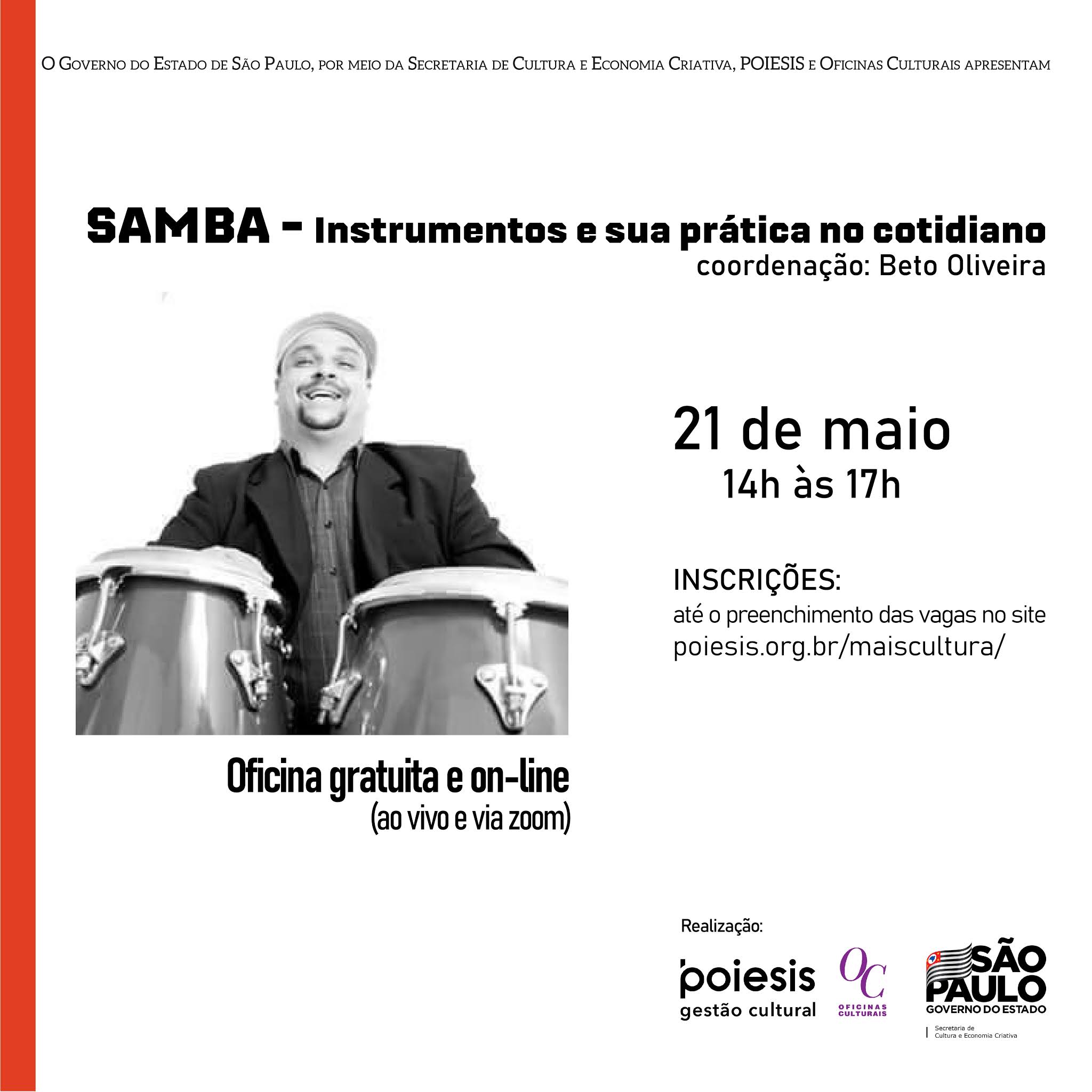 Com sua origem africana, dentro dos instrumentos trazidos pelos escravizados, o samba é a grande riqueza cultural do Brasil. Essa oficina traz de maneira didática e objetiva, a prática de instrumentos básicos da grade de percussão e suas funcionalidades na música brasileira.