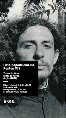 O programa Pontos MIS, que traz uma sessão de cinema online seguida por bate-papo ao vivo, apresenta, em parceria com a Vitrine Filmes, o documentário Torquato Neto – todas as horas do fim (dir. Marcus Fernando e Eduardo Ades, documentário, 87 min, 2018, 12 anos), sobre um dos pensadores e letristas mais ativos da Tropicália e figura proeminente da arte marginal junto a Waly Salomão, Ivan Cardoso e Hélio Oiticica.