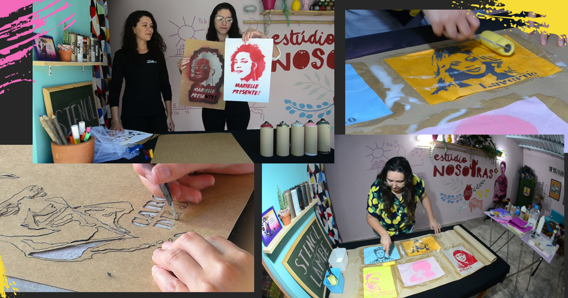 Oficina conduzida pelas artistas Jaque Alves, Patrícia, Paula Mello e Yasmin Alves tem como objetivo explicar o passo a passo de maneira introdutória do que é o stencil e lambe lambe, sua origem e importância. O stencil consiste na confecção de um molde vazado proporcionando a reprodução de uma imagem, utilizando tinta spray e tendo o muro como suporte, já o lambe lambe é um cartaz que pode ser fixado em várias superfícies. A ideia é mostrar a versatilidade da prática no que diz respeito as possibilidades de produtos criados, apresentando todos os processos que envolvem a criação. Para além de compartilhar as técnicas artísticas, o projeto traz uma homenagem à memória da atuação política de mulheres que inspiram a caminhada coletiva para construção de outro mundo possível, entre elas Angela Davis, Frida Kahlo, Carolina de Jesus entre outras.
