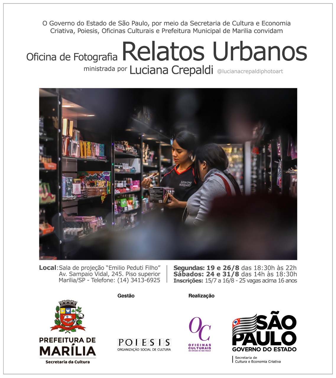 A Prefeitura Municipal de Marília, por meio da Secretaria da Cultura, em parceria com a Poiesis - Organização Social de Cultura - Programa Oficinas Culturais da Secretaria de Cultura e Economia Criativa do Governo do Estado de São Paulo, realizará de 19 a 31 de agosto a Oficina de Fotografia: Relatos Urbanos, com coordenação da fotógrafa Luciana Crepaldi que possui obras da Coleção “Olor Visual” e da “Arte e Naturaleza”, ambas de Madri. As oficinas serão ministradas as segundas-feiras, das 18h30 às 22h e aos sábados das 14h às 18h30, na Sala de projeção “Emílio Peduti Filho”.