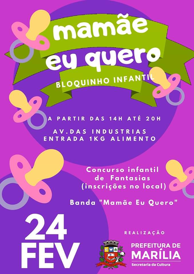 Para o público infantil, a Secretaria da Cultura preparou o bloquinho “Mamãe Eu Quero”, com concursos de fantasias para os pequenos, que acontecerá na avenida das Indústrias, a partir das 14h, no dia 24 de fevereiro.