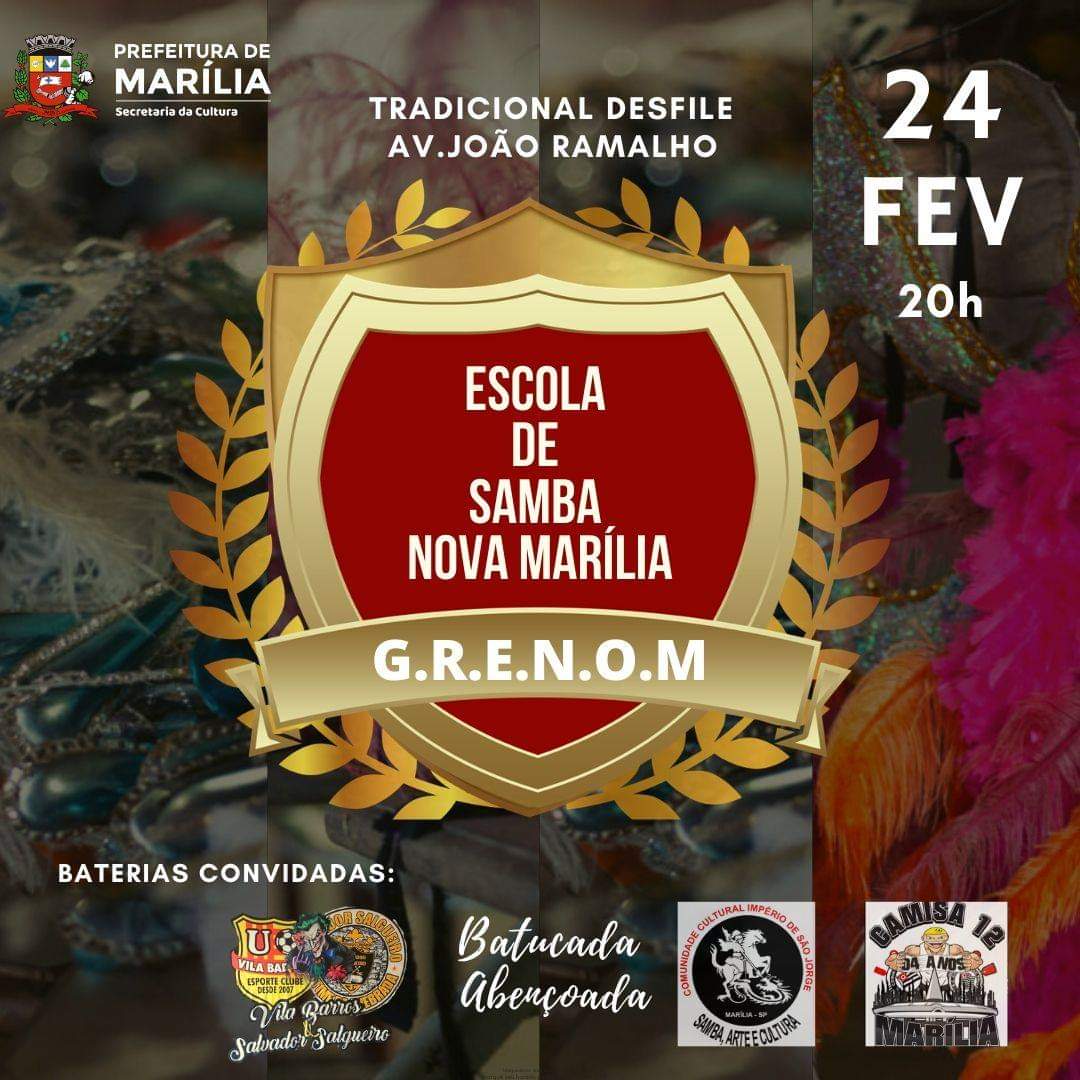Tradicional desfile da Escola de Samba Nova Marília, com participação da Bateria da Salvador Salgueiro, Império São Jorge e a Bola de Neve.