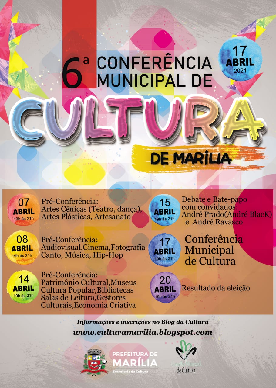 A Secretaria Municipal da Cultura e Conselho de Cultura realizarão no mês de abril a 6ª Conferência Municipal de Cultura. O evento será realizado nos dias 7, 8 e 14 (pré-conferências); 15 (bate-papo com convidados) e 17 de abril (Conferência).