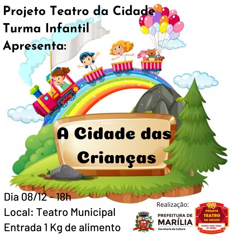 A Secretaria da Cultura, por meio do Projeto Teatro da Cidade, realizará apresentações das turmas do Infantil e Pré-Juvenil, neste final de semana, no Teatro Municipal. A entrada é 1 Kg de alimento não perecível.